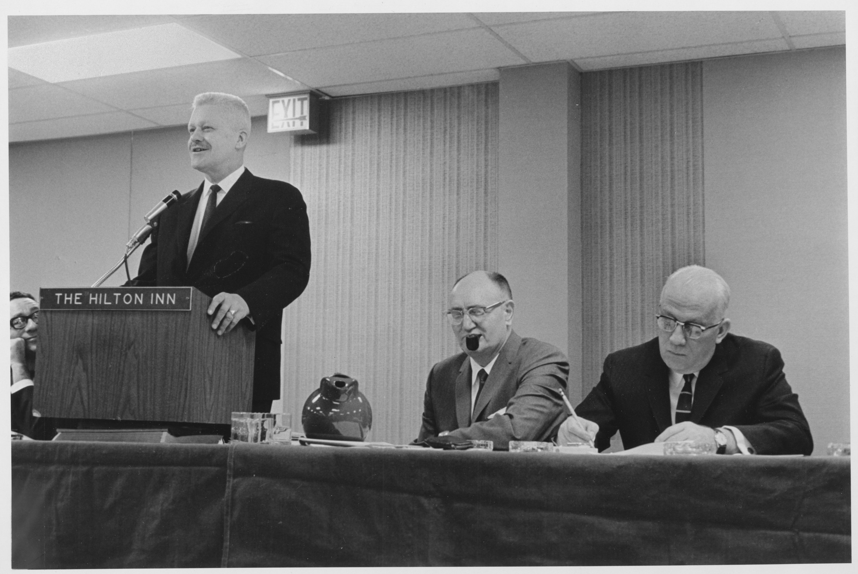 Jennings, John Gallione, and Hank Geist (at podium). |