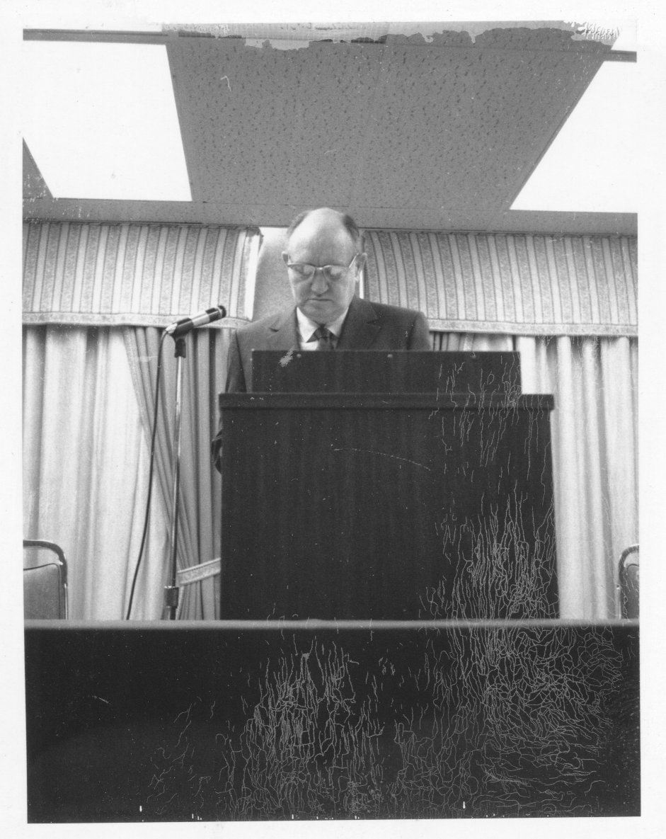 Jennings, John Gallione, George Dixon (VP Sales) at podium, Ray deP.